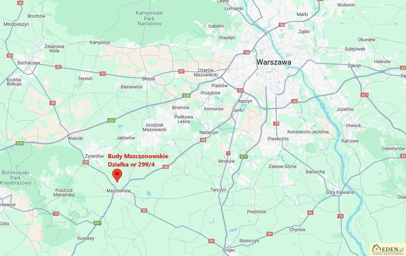 Działka położona jest w bardzo dogodnym punkcie komunikacyjnym zaledwie 1,5 km dzieli ją od drogi krajowej nr 50 oraz trasy ekspresowej S8, co zapewnia szybki i komfortowy dojazd do Warszawy (ok. 40 km), Żyrardowa (ok. 9 km), Mszczonowa (ok. 3 km) oraz Radziejowic (ok. 3 km).